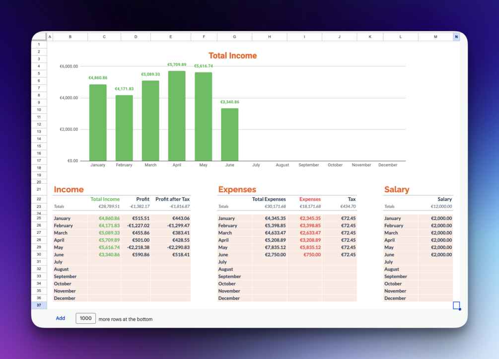 I’m Benas, a full-time freelancer & entrepreneur. Over the past ten years, I’ve grown my freelancing business from $1,000/month to consistently $10,000+/month, all while keeping my admin work under 1 hour per week. I created this Google Sheets template to eliminate the stress of tracking invoices, income, and taxes so I can focus on my clients. These are the exact sheets and workflows I’ve used to manage my freelance income and scale my business.